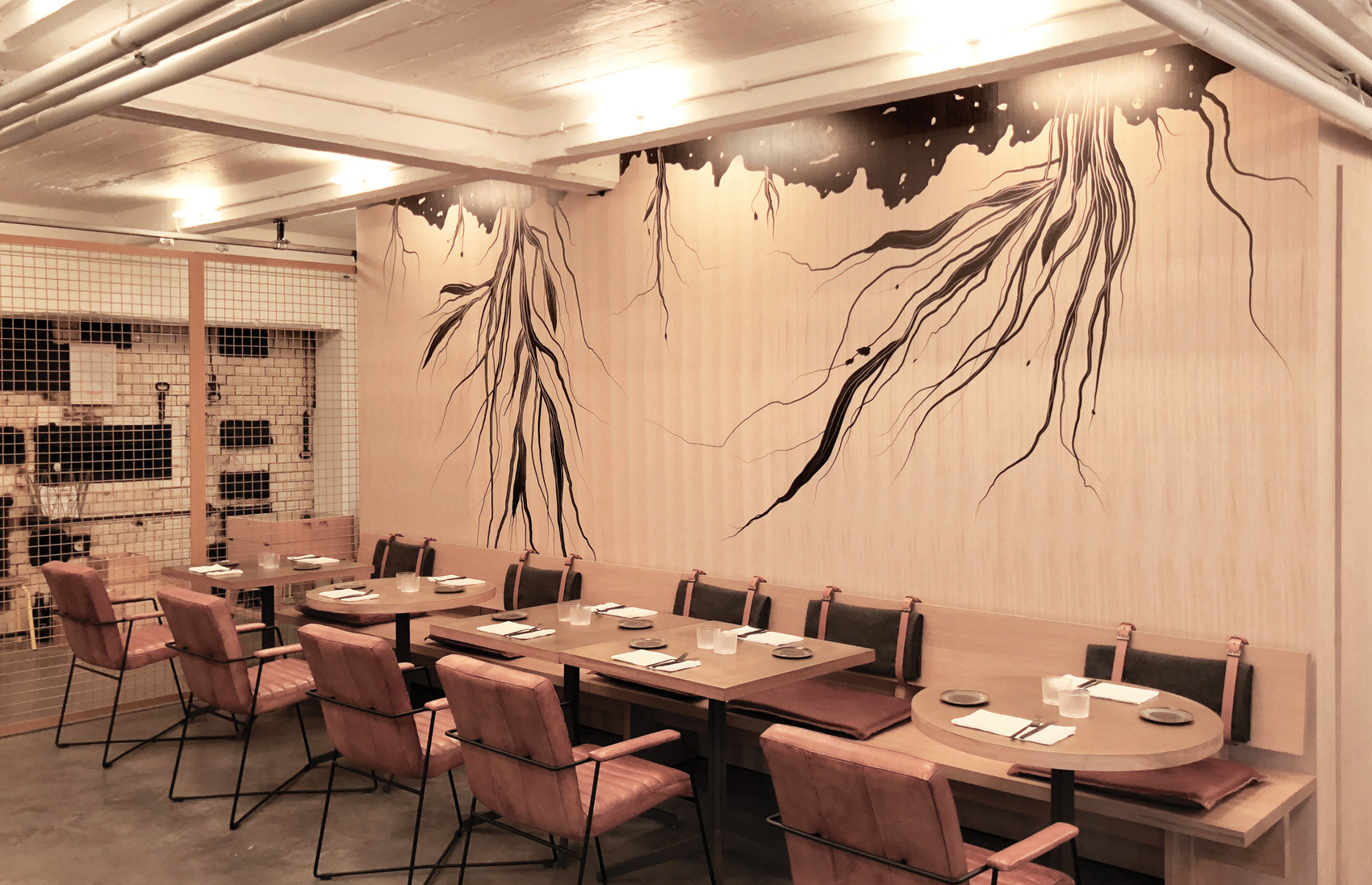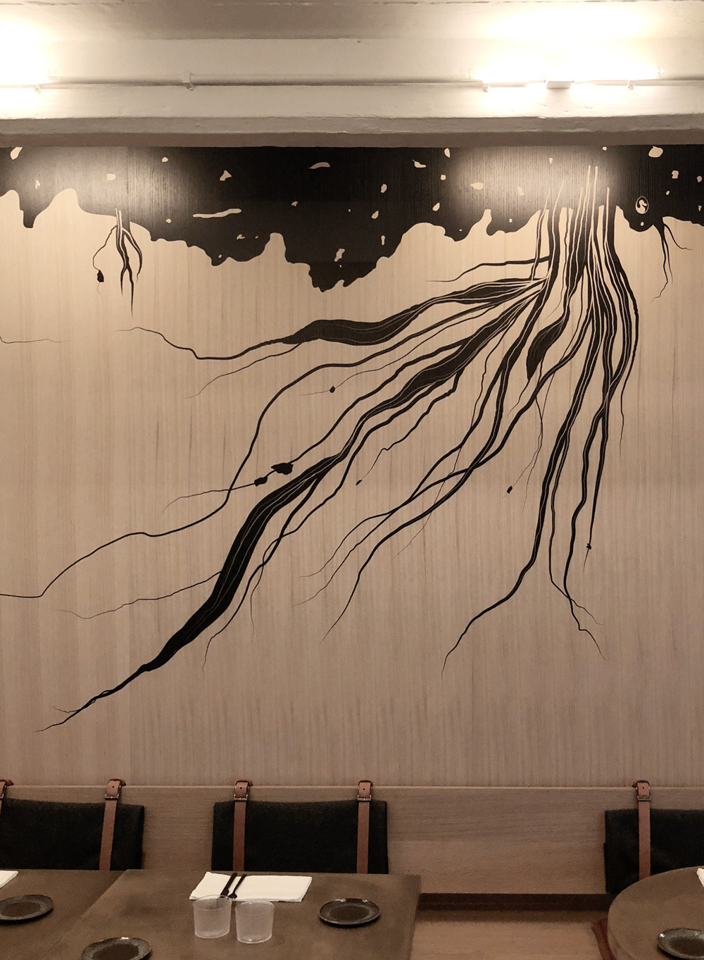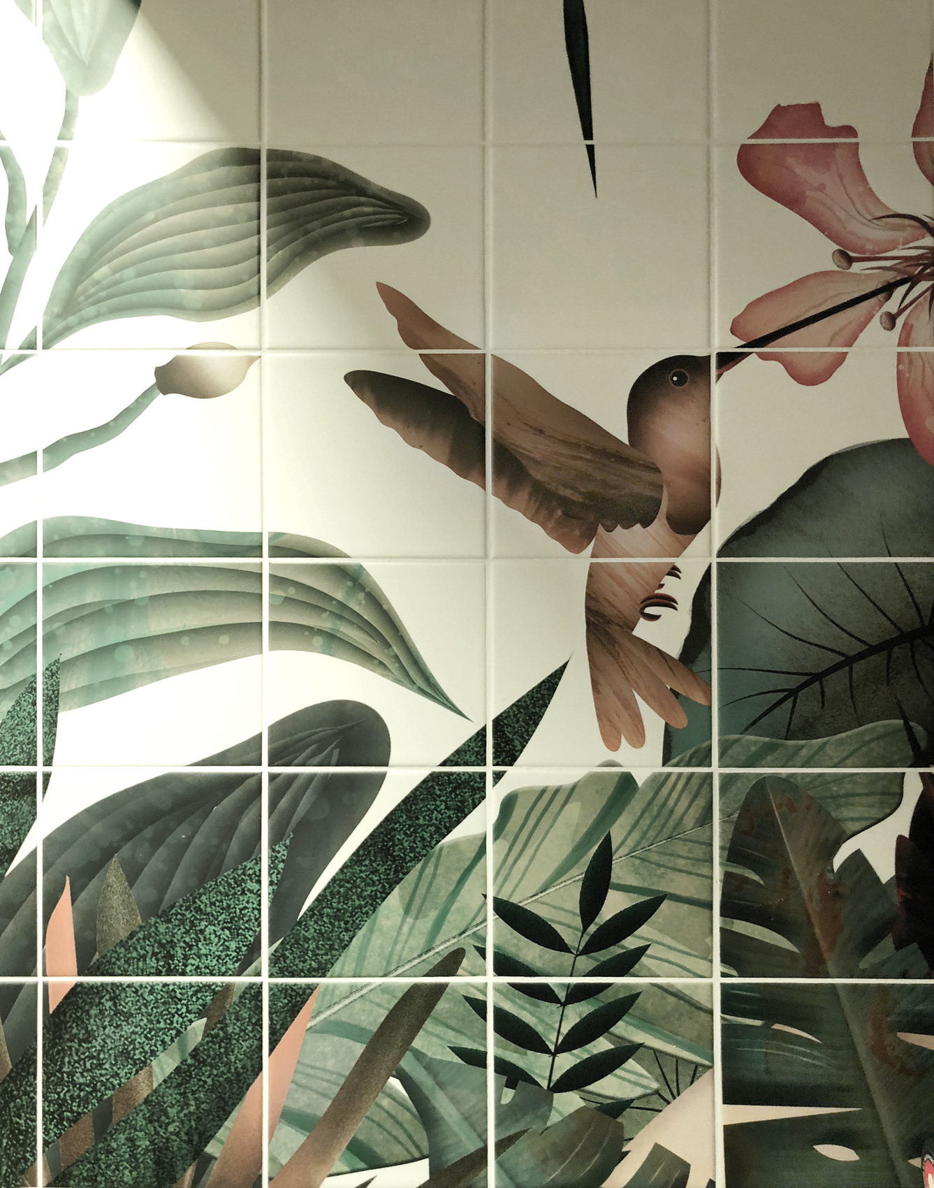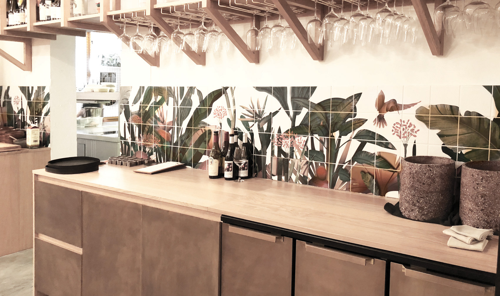 The newly rebooted restaurant L'épicerie du cirque just opened its doors. I was commissioned to illustrate a series of exotic botanical landscapes filled with playful humming birds. These dynamic illustrations were transferred onto the tiled walls of the kitchen and the bar area. This resulted in giving more depth and a hint of colour to the minimalist and stylised interior. On the main wooden wall in the dining area I created an intricate black root system as a reference to the their bar upstairs called Bar Palmier, as if the roots of the palms were coming through the ceiling. The interior was done by Not Before Ten.