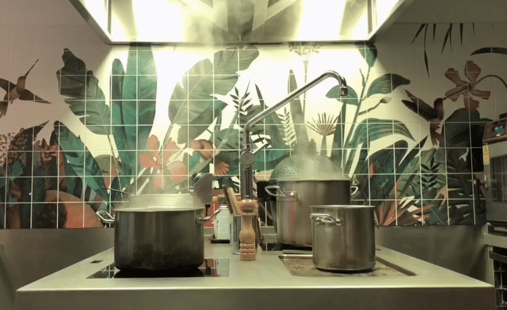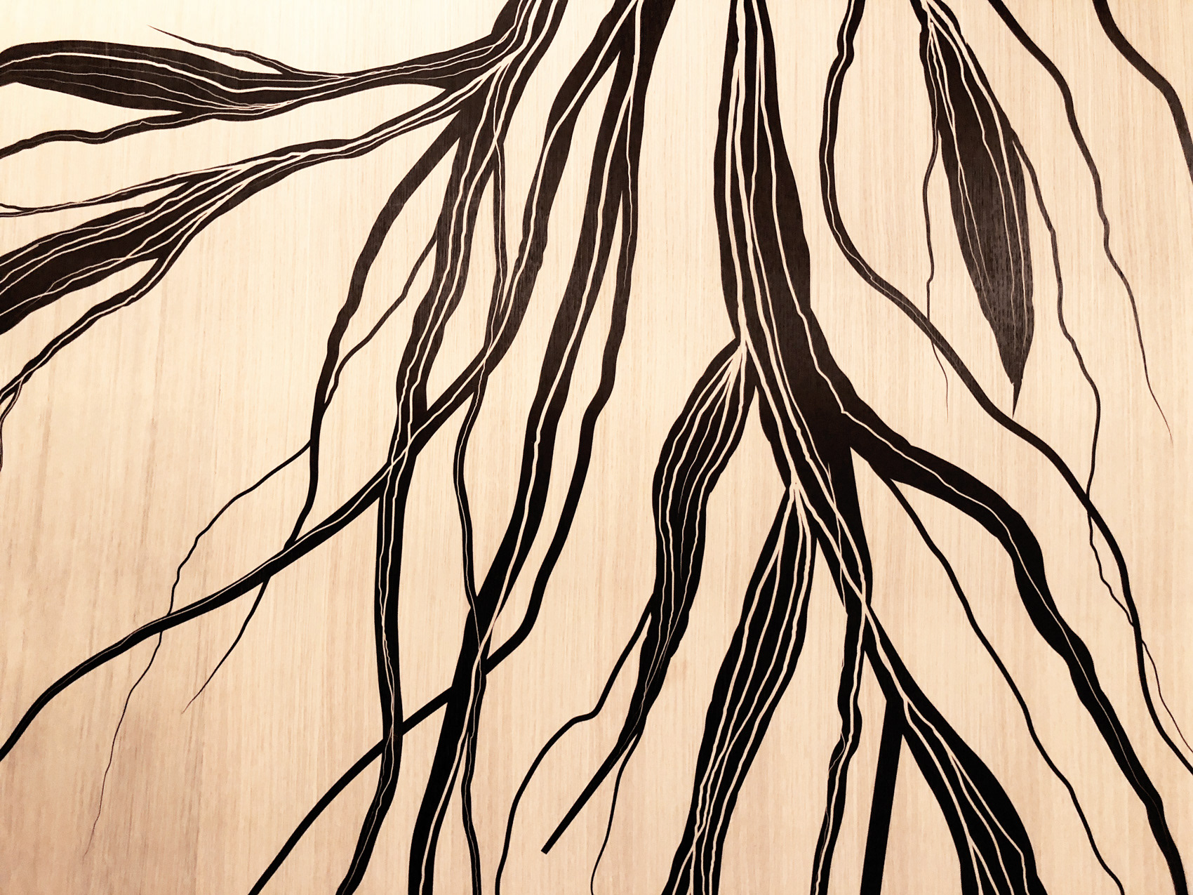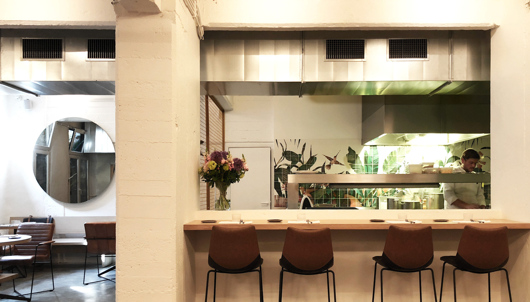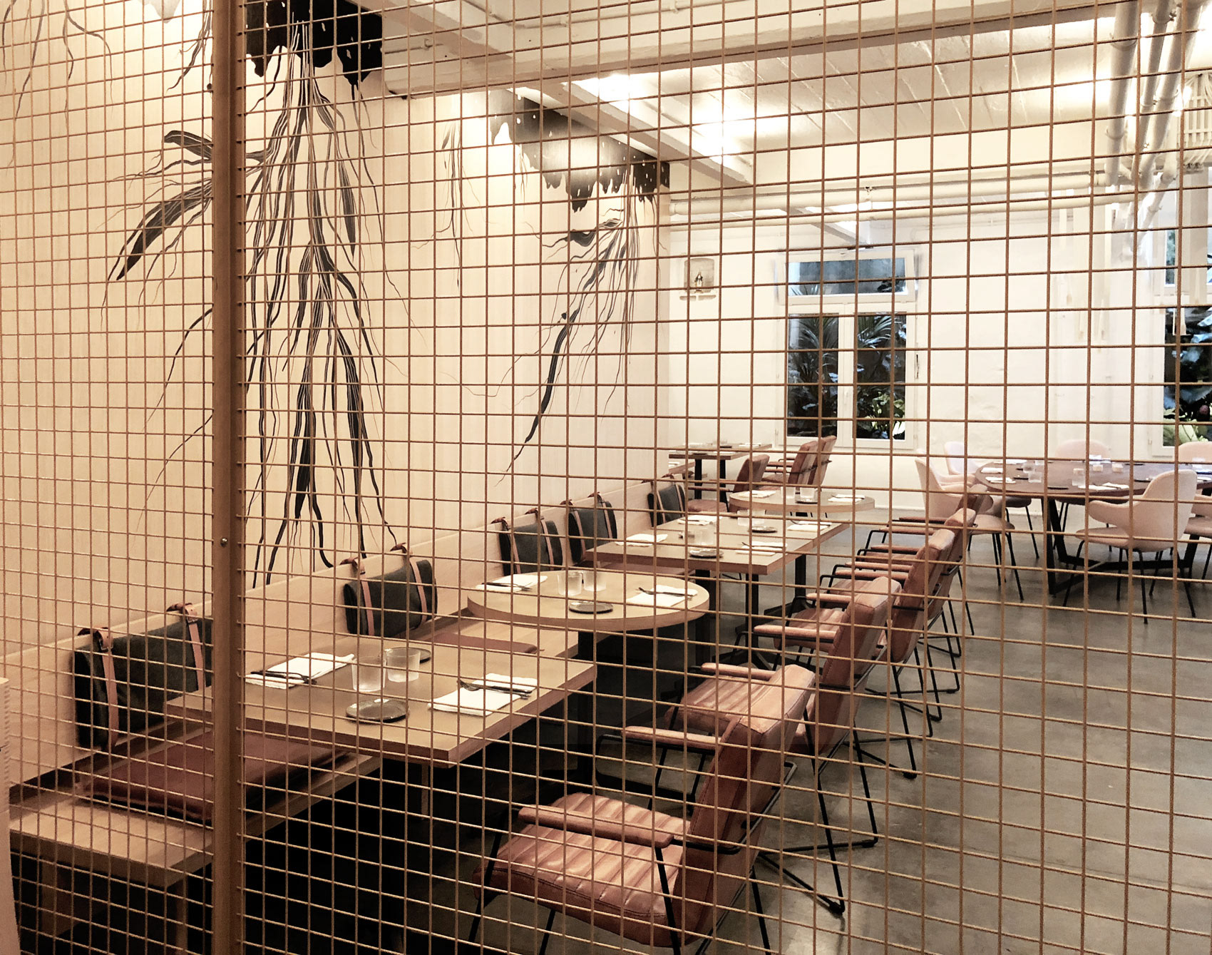 The newly rebooted restaurant L'épicerie du cirque just opened its doors. I was commissioned to illustrate a series of exotic botanical landscapes filled with playful humming birds. These dynamic illustrations were transferred onto the tiled walls of the kitchen and the bar area. This resulted in giving more depth and a hint of colour to the minimalist and stylised interior. On the main wooden wall in the dining area I created an intricate black root system as a reference to the their bar upstairs called Bar Palmier, as if the roots of the palms were coming through the ceiling. The interior was done by Not Before Ten.